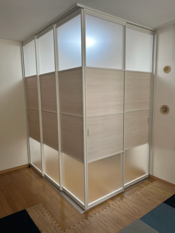タチカワブラインド プレイススウィング 折戸+引戸リビングの一角にプレイススウィング折戸+引戸を取付をして個室を一部屋作りました。折戸+引戸を取付けたので引戸で出入りをして頂きパネルを畳めば今まで通りの広いリビングとしてもご使用出来ます。部屋の可動式間仕切りをご検討中のお客様はお気軽にお問い合わせください。